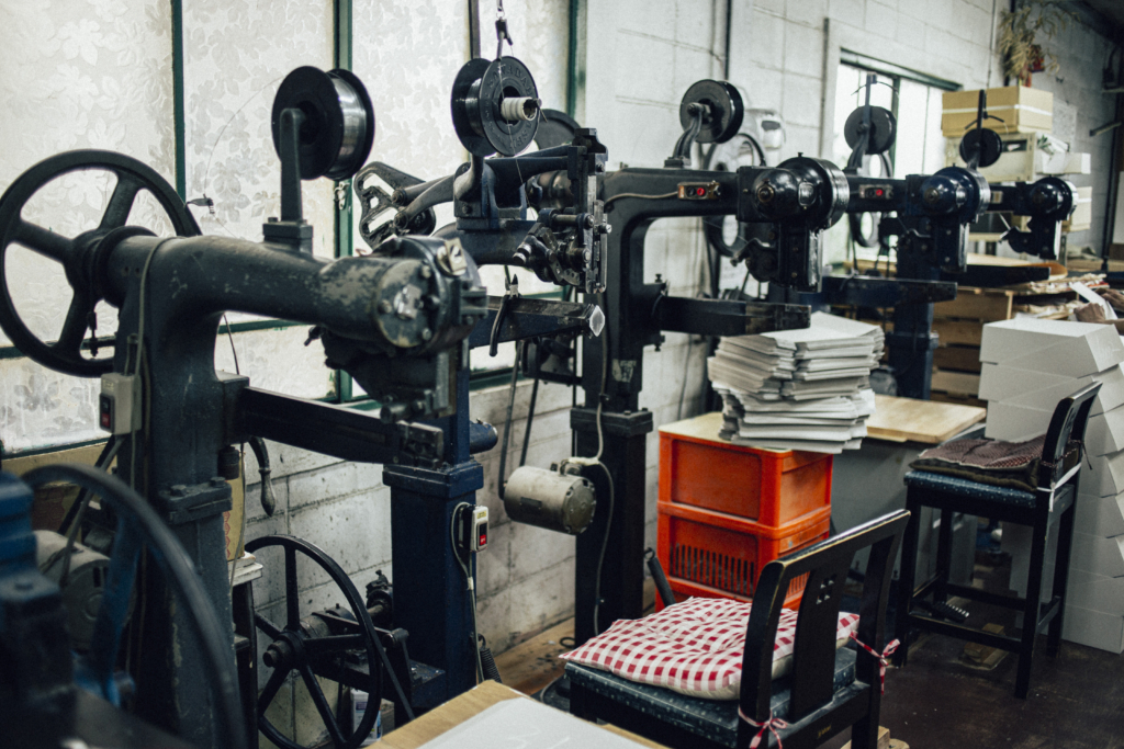 四角止め機/平止め機箱の四角をホッチキスのように針金やテープで留めていく機械です